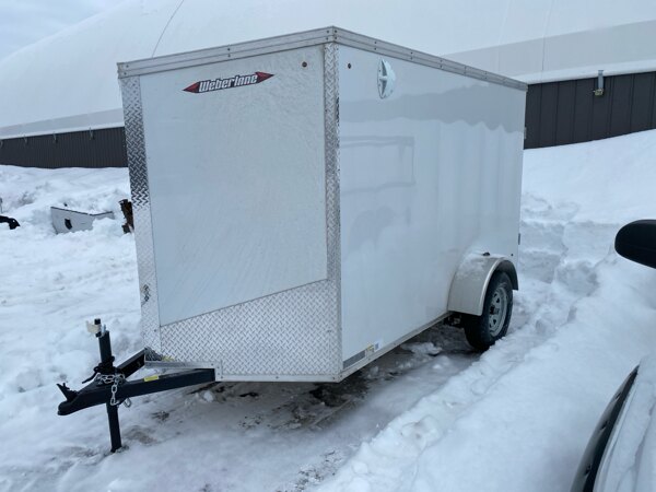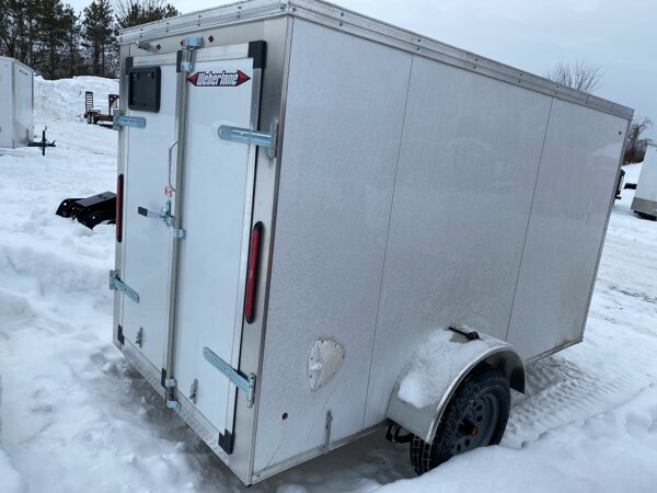 steel 6' wide x 10' long enclosed V nose Cargo trailer, 6'6" interior height, 11'10" total interior length, 32" curbside man door, heavy duty rear...