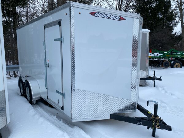 enclosed contractor level steel frame 7' wide 14", wedge nose, 32" side door, rear barn doors, 16" side tube post c-c, 16" floor cross, 16 roof...