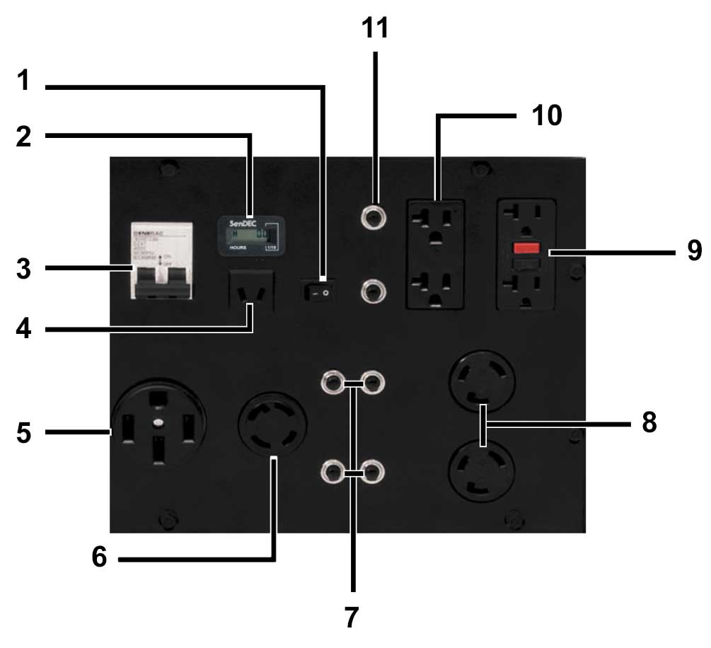 1. Idle Control Switch 2. Hour Meter 3. (1) 50A 2P Circuit Breaker 4. (1) 12VDC 10A Outlet 5. (1) 125/250V 14-50R Outlet 6. (1) 125/250V 30A L14-30R Twist Lock Outlet 7. (4) 30A 1P Circuit Breakers 8. (2) 120V L5-30R 30A Twist Lock Outlets 9. (1) 120V 20A 5-20R GFCI Duplex Outlet 10. (1) 120V 20A 5-20R Duplex Outlet 11. (2) 20A 1P Circuit Breakers |