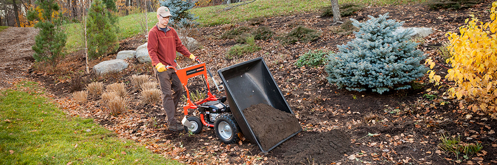 | Transport loads up to 500 lbs. and do it in tight quarters where you could never take a trailer. Power driven wheels do the hard work. Three forward speeds and one reverse make it easy to maneuver. One-piece molded bed is great for fine or wet materials that need to stay contained. |