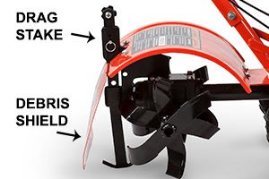 The drag stake provides extra resistance. When not needed, it can be raised and pinned in place. The debris shield protects operator from thrown soil.